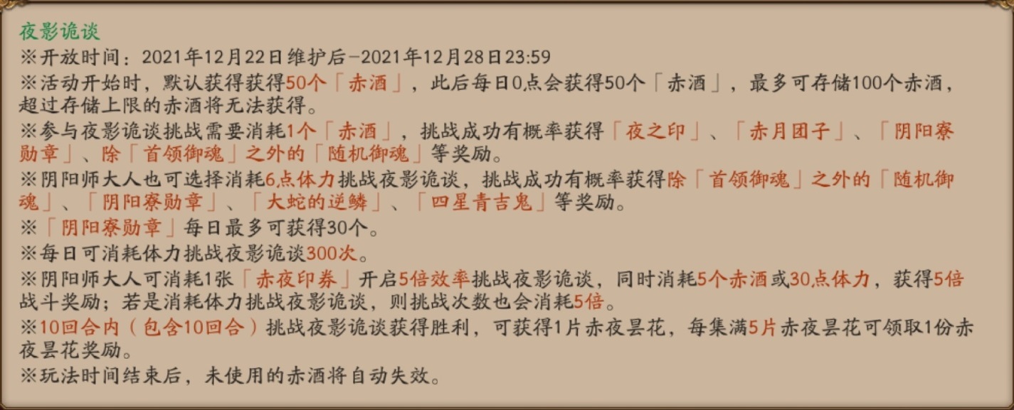 *阴阳师大人可消耗'赤酒'参与夜影诡谈玩法,获胜后可获得夜之印、随机御魂、阴阳寮勋章、大蛇的逆鳞、四星青吉鬼。