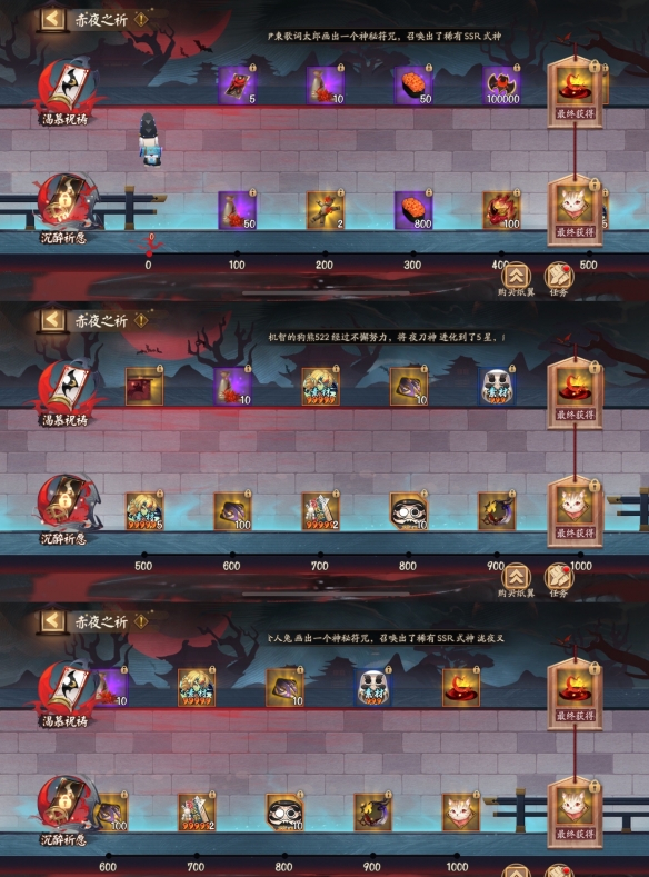 *累计一定数量的'夜之印'将可以兑换SR阶式神吸血姬皮肤'绯夜星灯'、限定头像框'绯夜魔'、契约书·御行达摩、随机SSR/SP式神召唤券等奖励。