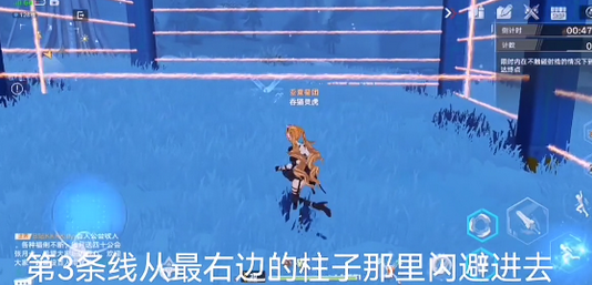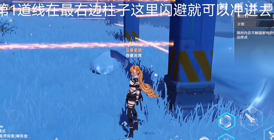 第三条线从最右边的柱子那里闪避进去,走过去也行,趁激光往回弹的时候过去就好