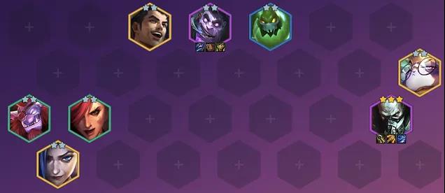 阵容的蔚+巨魔不动,6~7人口的阶段开始对阵容进行转型,笔者比较推荐大家转的一个体系是赏金的体系,2张3费卡船长、女枪都是相对实用的打工牌,尤其是3费卡的普朗克,早期打工可以考虑去带金克丝/厄加特的装备打工,这样前期靠2星船长可以相对容易的去稳住局势。6人口一般是不D牌的,从成型体来看,这个阵容需要的4、5费卡相对比较多,尽快的抢7上8这样更容易稳住阵容的强度。(7人口尽量去白嫖4费厄加特,等8人口以后看状态是否能拉9,考虑追厄加特的3星。