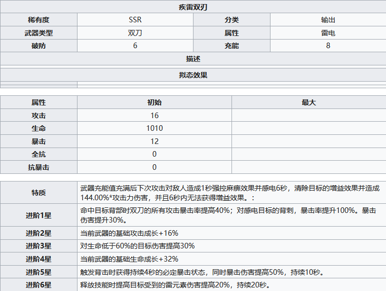 街机cn 来源:厂商 发表于:2021-12-23幻塔疾雷双刃怎么样?疾雷双刃是幻塔游戏内雷属性双刀类的SSR武器,很多小伙伴想知道幻塔疾雷双刃怎么样,今天为大家带来了幻塔疾雷双刃武器属性分享,一起来看看吧。