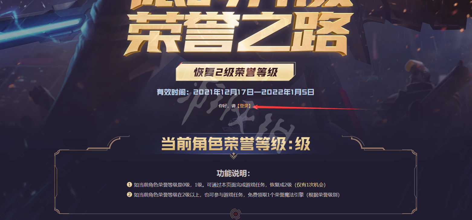 1.如当前角色荣誉等级是0级,1级。可通过本页面完成游戏任务,恢复成2级(仅有1次机会)。