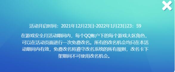 在游戏安全月活动期间内,每个 QQ 账户下的每个游戏大区角色,可以在活动页面进行一次免费改名。所有的改名机会均只在本活动期间内有效,免费改名将遵守改名系统的所有规则,改名卡下架期间不可使用改名机会。