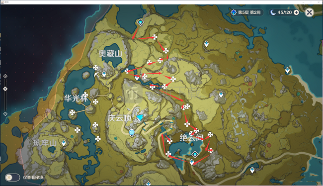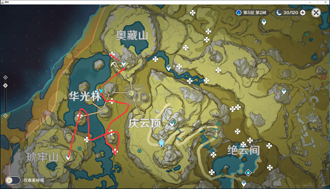 还有就是奥藏山的下方,这里的绝云椒椒虽然没有前面两个地方的多,也没有前两个地方的密集,但是我们也可以获得大概25个绝云椒椒,首先我们可以在下图中看到,在奥藏山西方的传送点有大概5个绝云椒椒,而且这里还有着矿产资源,玩家可以顺路收集,然后来到华光林右方的位置,在这里也有着10个左右的绝云椒椒,然后沿着途中红线的位置一直收集,能够收集到不少的绝云椒椒,当你收集完之后这些数量就够我们用一段时间了。