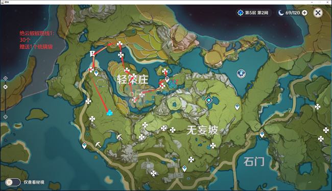 绝云椒椒在游戏中的任何地方都可以看到,首先我们可以来到轻策庄,这里的绝云椒椒分布还算密集,玩家能够在短时间内获得足够的绝云椒椒,具体的路线如下图所述,途中标记花朵的地方就是绝云椒椒的采摘地点。我们可以看到在轻策庄的周边都有着非常多的绝云椒椒。小编统计了一下,这里有着大概30个。