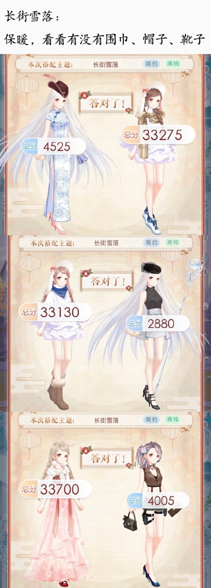 1、【长街雪落】需要选择简约、清纯、保暖的搭配,大家可以参考圣诞家庭聚会来选择。穿戴了【围巾】项,保暖部件,分数比较高