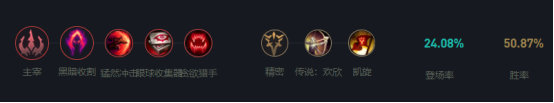 主系方面主打爆发收割,黑暗收割攻击残血敌人可收集灵魂并提升对残血敌人伤害保证稳定击杀,猛然冲击突进可收益一定的穿透效果,眼球收集器随着击杀守卫永久提升我们的自适应收益,贪欲猎手随击杀永久将我们的技能伤害转换为治疗效果。