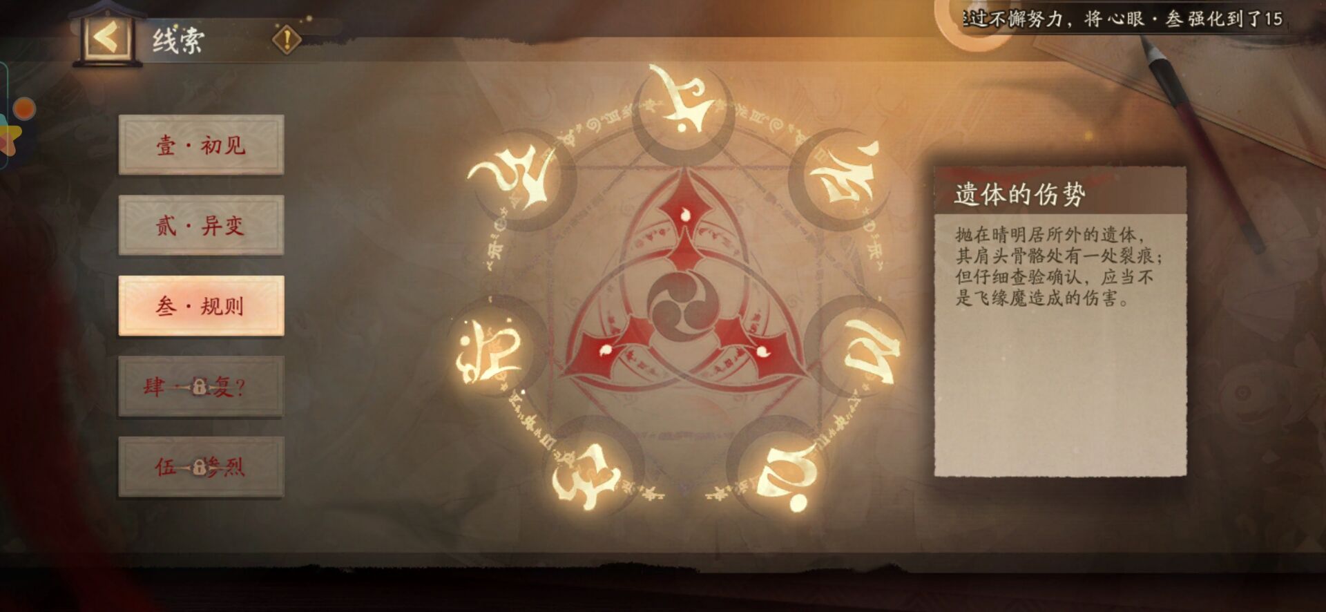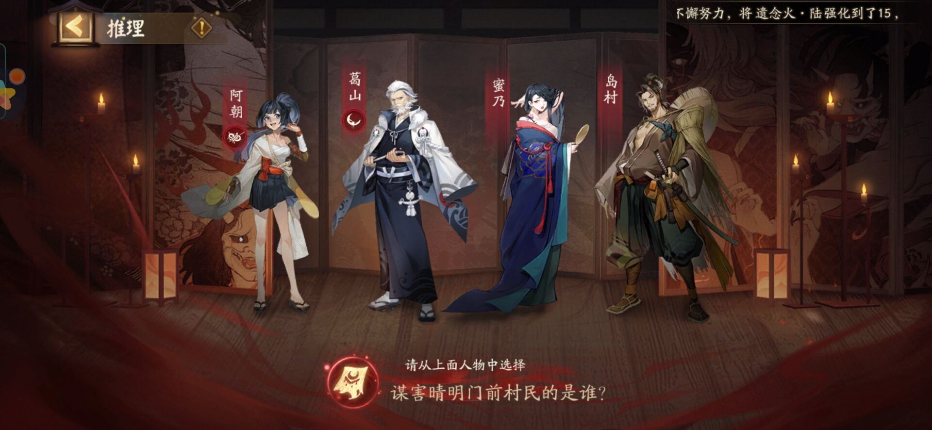 *每个剧情章节将会有一个'推理'目标,需要阴阳师大人在四位村中人之间指认。