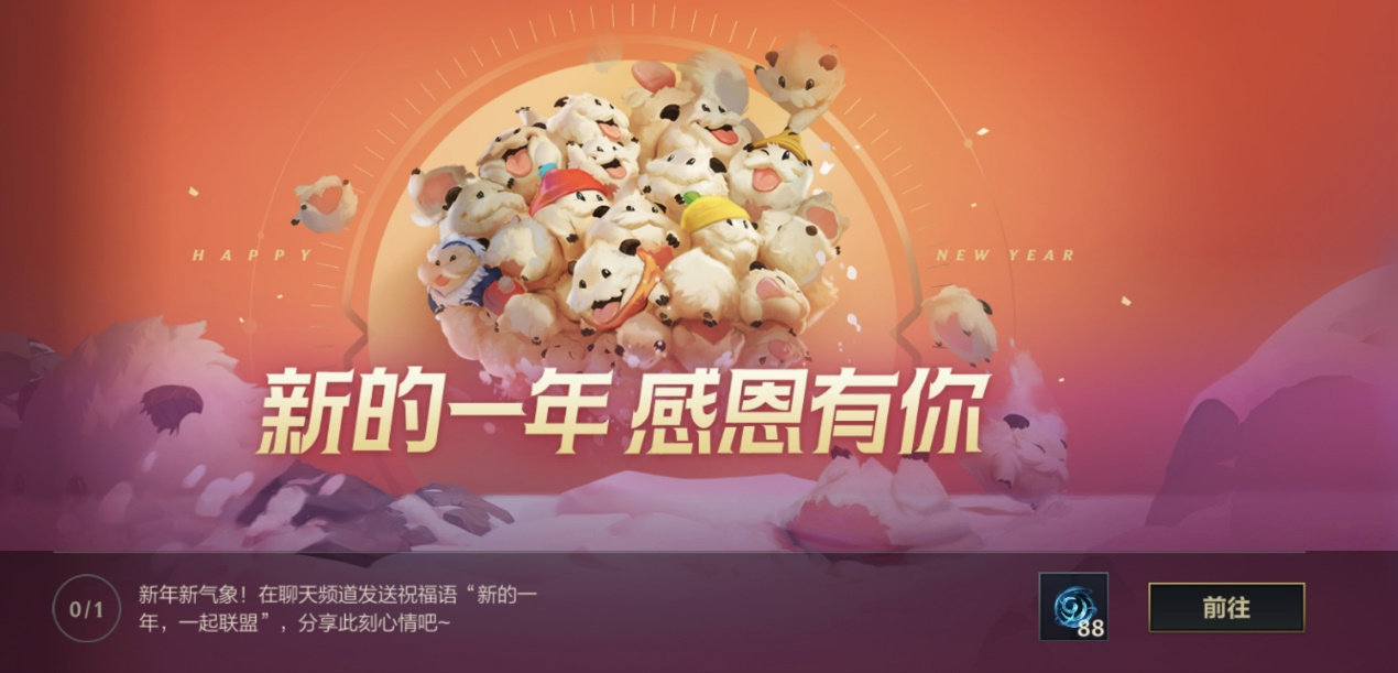 2022年即将到来,召唤师们一起发送祝福吧!活动期间,在游戏内聊天综合频道发送指定祝福语【新的一年,一起联盟】分享心情,还能领取88魄罗能量~