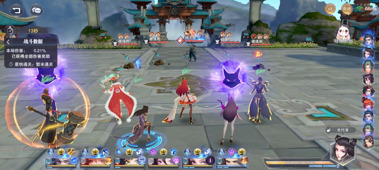 阵容如上(8人阵可以加佘龙或者御风再加秦明),开场一定要设置好自动,如上图设置,火舞第一回合第二回合放一,之后挂四,唐昊等月华15层以后选择挂四,刚好能吃满,满层数了鬼魅挂四。猫猫满印记挂一,月华满层数挂四。