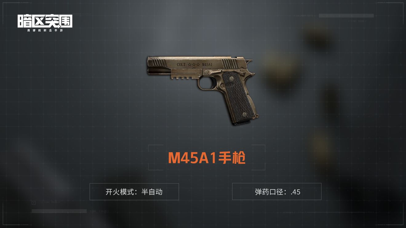 使用.45口径子弹,威力偏小的手枪。很多先锋都将它误认为是M1911,完全可以理解。因为它是以M1911手枪为蓝本研制及生产的,弹匣供弹的半自动手枪。这里算是老皮设置的一个迷惑选项,嘿嘿。