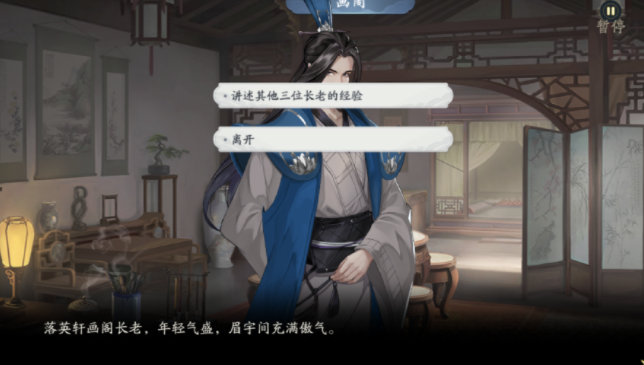 9、返回落英后殿,进入画阁,画阁长老(聊天,长老好人呐!)捡起桌面修为