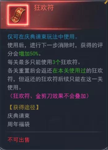 使用狂欢符,可以使下一次消除时获得的评分增加50%。