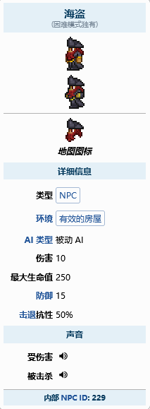 海盗是困难模式 NPC,在打败至少一次海盗入侵后并有空房屋可用时会出现。他和海盗入侵中的敌怪海盗船长长的几乎一模一样。