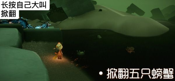 在光遇所有地图中累计找到5只螃蟹并长按大叫将螃蟹掀翻即可完任务;