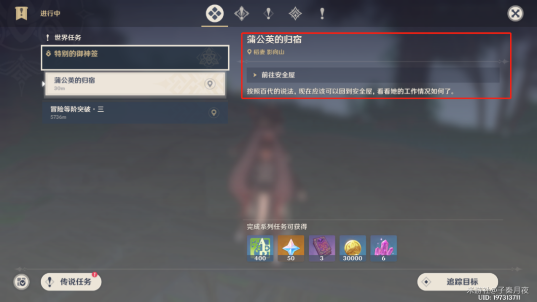 打开任务界面,可以看到任务已经触发了,显示着:按照百代的说法,现在应该可以回到安全屋,看看她的工作情况如何了。