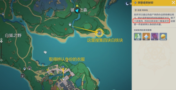 前往任务地点,指出了两个地方,上面那处是获得四块白铁块的,下面那个八重堂附近的才是获得衣服;应该可以直接去下面那个地方,我是两个地方都跑了。