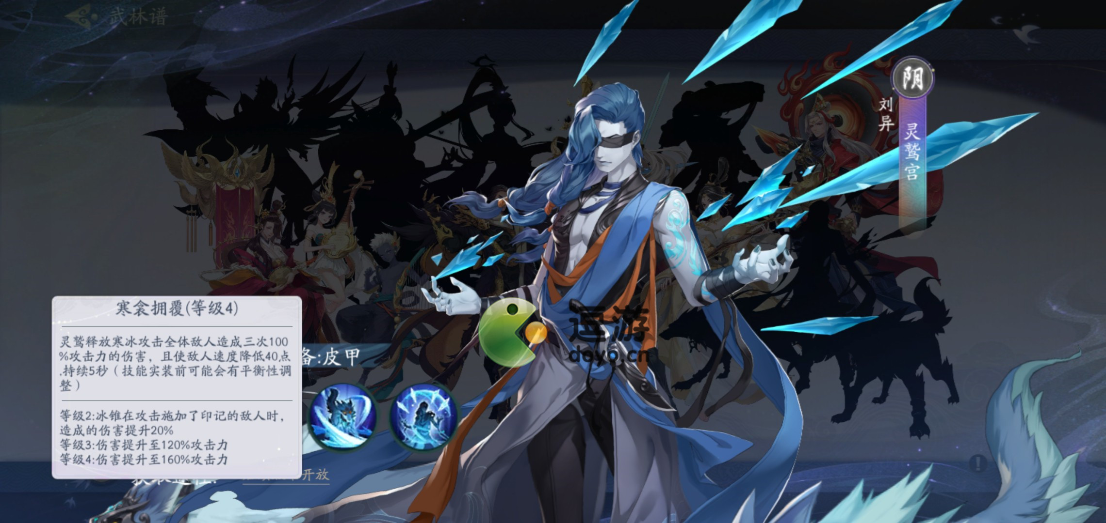 5、四技能:灵鹫宫的保命和小输出技能,被冰犬标记的侠客会受到120%攻击力的真实伤害,灵鹫宫受到致命伤害献祭一条冰犬无敌两秒并恢复生命值