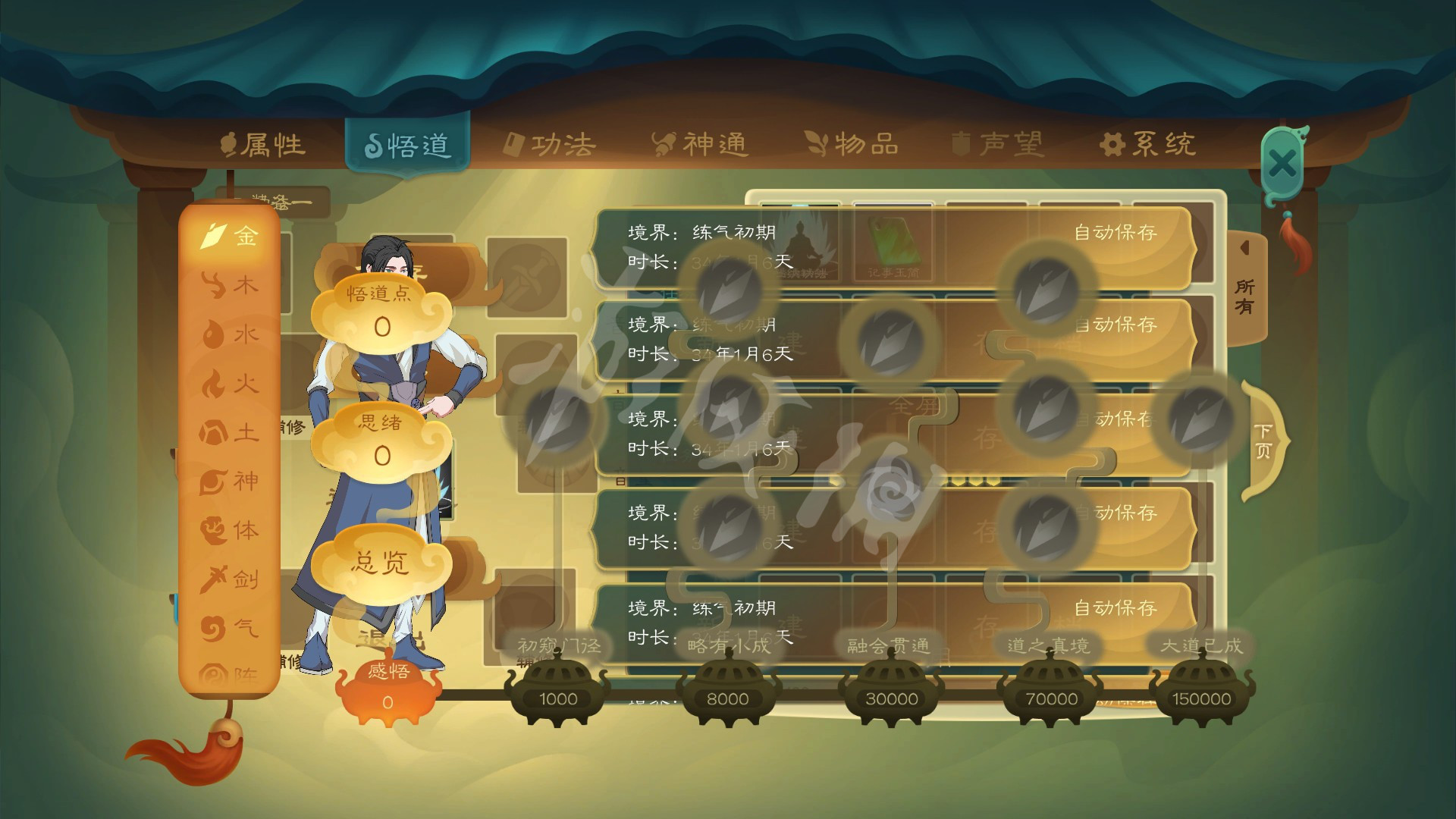 顺便做下主城收集任务,既能炼丹加经验也能赚钱。灵感满了就找师傅论道,开局的-30心境可以在倪家+10 永安学堂+20回复过来,通过收集的1-2品丹药也能拉到第二层。不追求30年丹圣就把玄武点上。