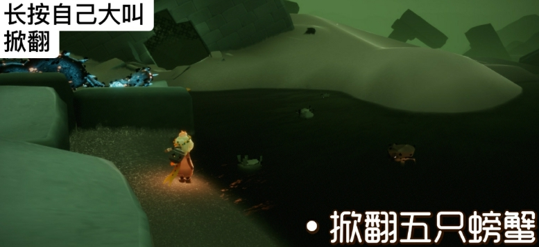 3、任务三:找到螃蟹之后站在它们旁边,长按自己使用大叫掀翻它们,一共需要掀翻五只。