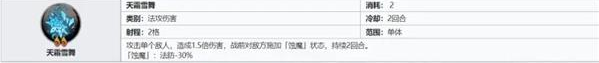 常规单攻【天霜雪舞】:攻击单个敌人,造成1.5倍伤害,战前对敌方施加「蚀魔」状态,持续2回合。