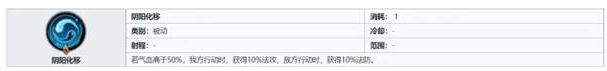 专属被动【阴阳化移】:若气血高于50%,我方行动时,获得10%法攻,敌方行动时,获得10%法防。