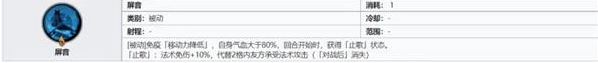 专属被动【屏音】:[被动]免疫「移动力降低」,自身气血大于80%,回合开始时,获得「止歌」状态。
