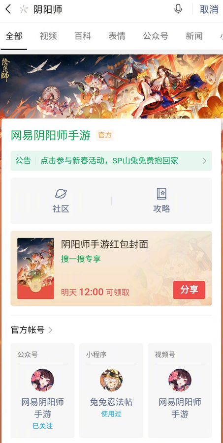 打开微信搜一搜,输入[阴阳师]点击对应位置,即有机会免费领取阴阳师新春限定红包封面~