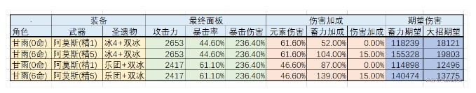 考虑到由于敌人不总是在冰冻状态下,对冰4甘雨的蓄力射击,只计算了55%的暴击加成,大招伤害也只计算了35%的暴击加成,均不考虑冻结状态。