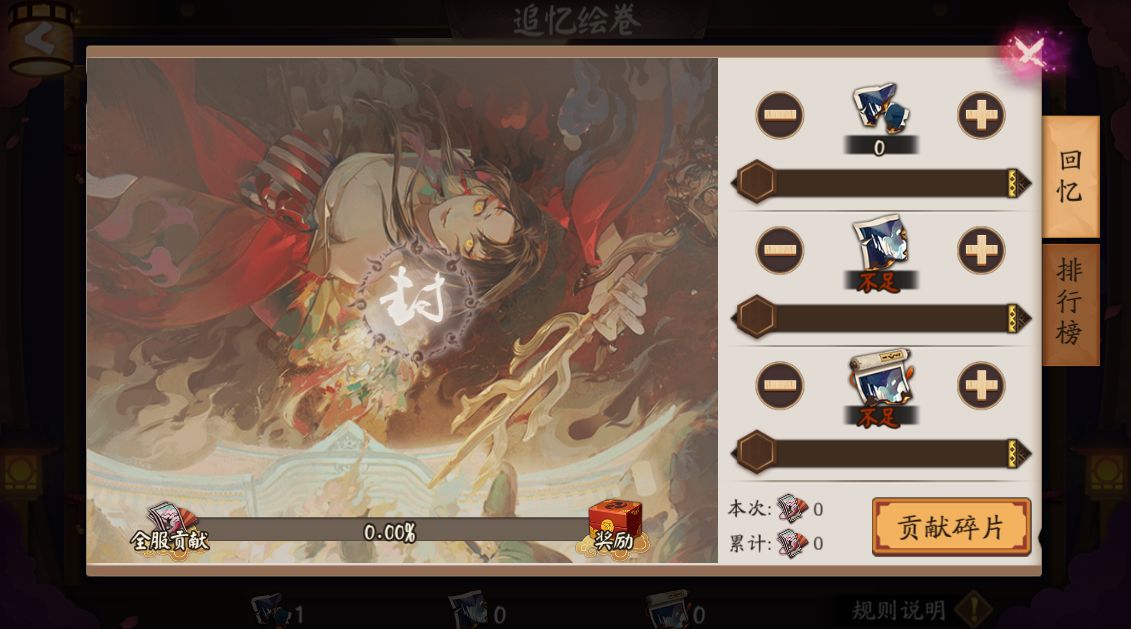 1、铃彦姬追忆绘卷由六张绘卷组成,需独立捐赠碎片进行修复,同时独立计算排名奖励;