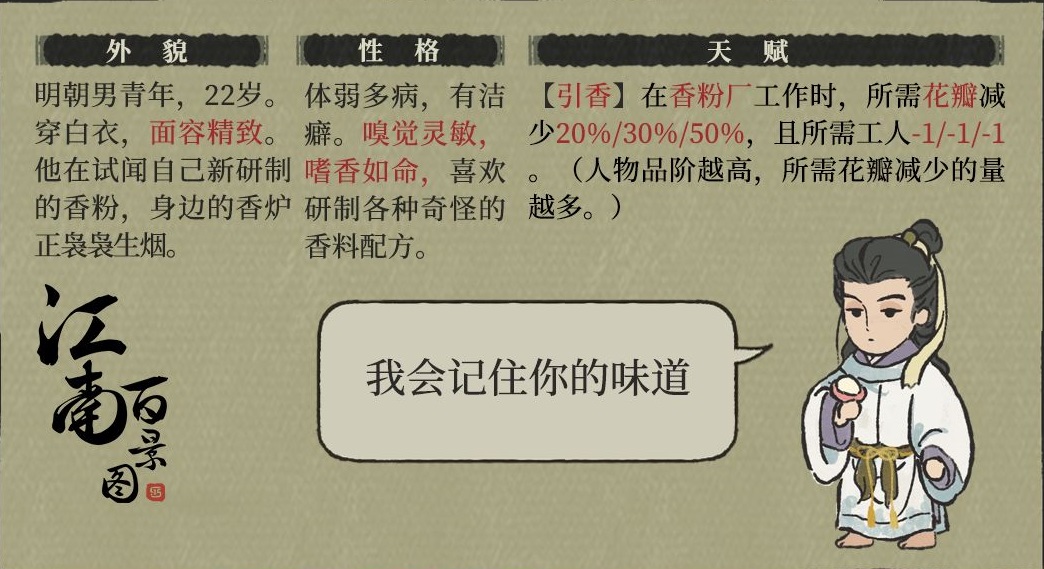 【引香】在香粉厂工作时,所需花瓣减少20%/30%/50%,且所需工人-1/-1/-1□。(人物品阶越高,所需花瓣减少的量越多。)