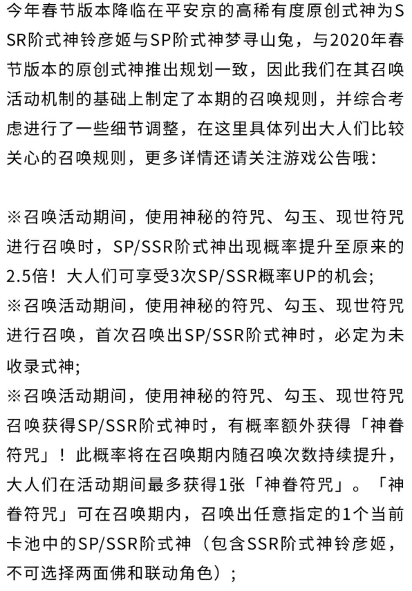 2)有概率获得最多一张神眷符咒,可以召唤一个任意指定的当前卡池内的SSR或SP(不包括联动式神和两面佛),600抽保底获得神眷符咒