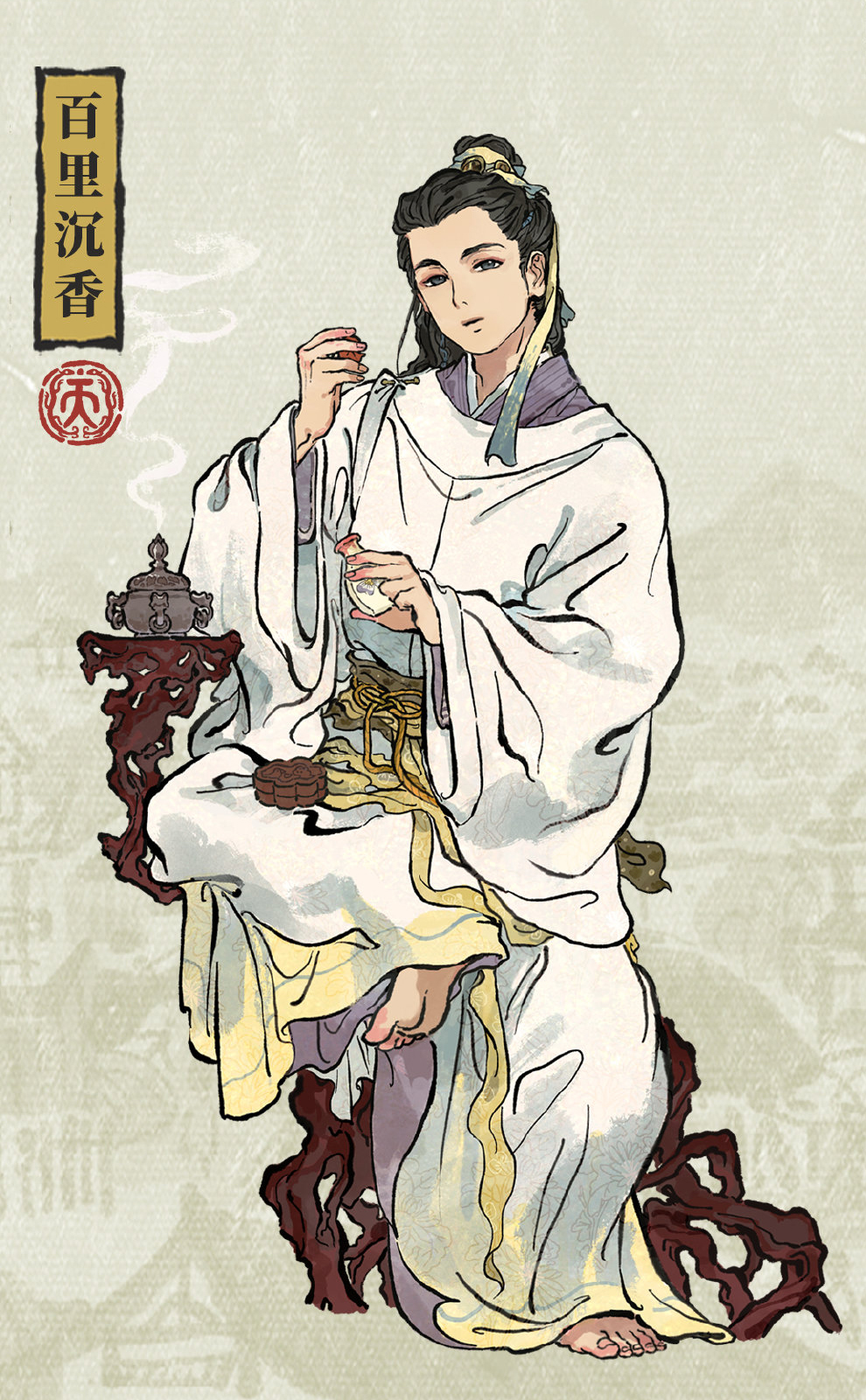 明朝男青年,22岁穿白衣,面容精致。他在试闻自已新研制的香粉,身边的香炉正袅袅生烟。