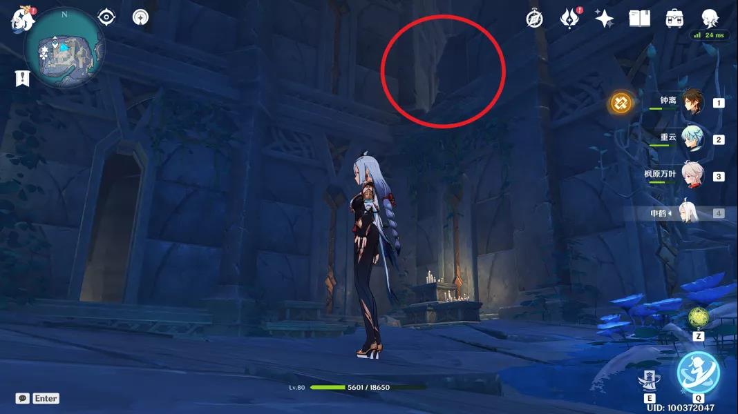 回头,往南方向看,可以在上方看见一个小洞(左边的房间内有摩拉箱),爬上去