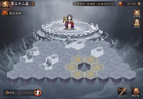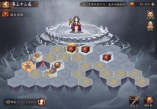 2、活动界面是铃彦姬视频里跳舞祈愿的祭坛,我们需要通过不断挑战怪物找到下一层祭坛的入口(阵容见02部分),每层起始位置随机,3分钟内挑战成功即可拿满奖励,有石头的格子必定有特殊奖励,比如宝箱、神乐铃、七支刀,这些是在挑战成功后需要再点一下领取的。