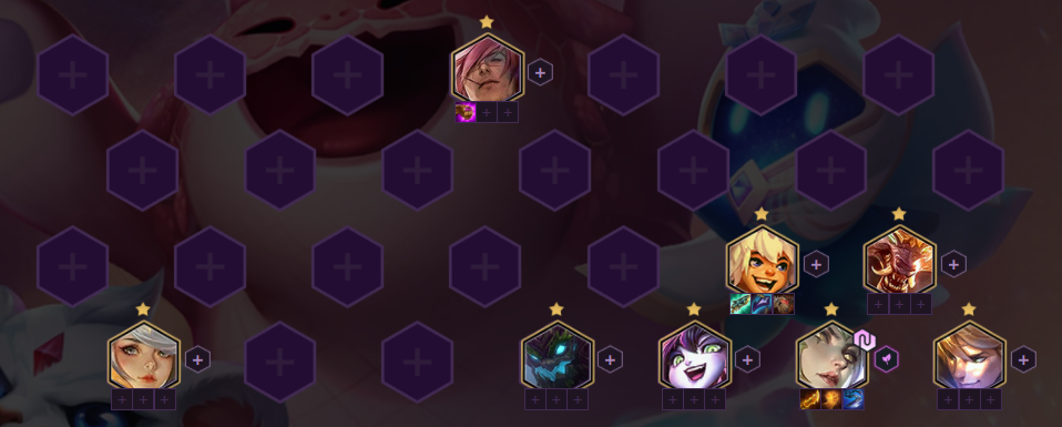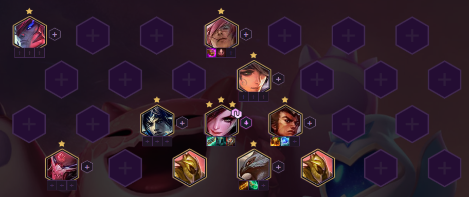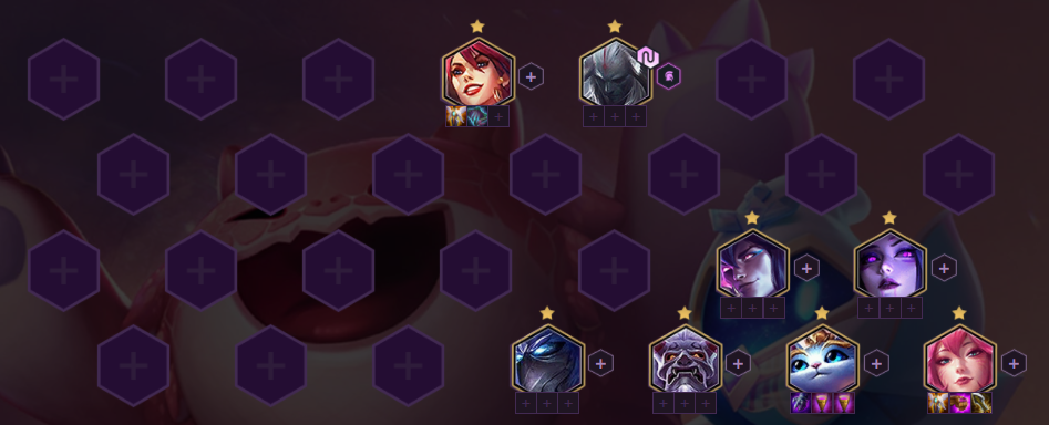 棋子构成:猪妹(瑟庄妮)、剑魔(亚托克斯)、锤石、蛇女(卡西奥佩娅)、慎、基兰、悠米、阿狸