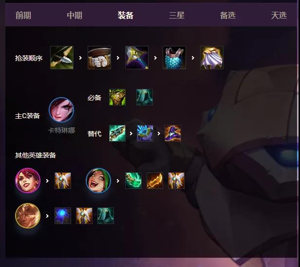 而莉莉娅、基兰这两个英雄不建议去追3星5费,虽然强,但是总体来说没有瑟提、盲僧、EZ、凯隐和沙皇这些英雄有爽感。其次3星永恩强度也是非常不错,装备可以全肉出也可以全输出出。基本大概所有英雄的出装都在这里。