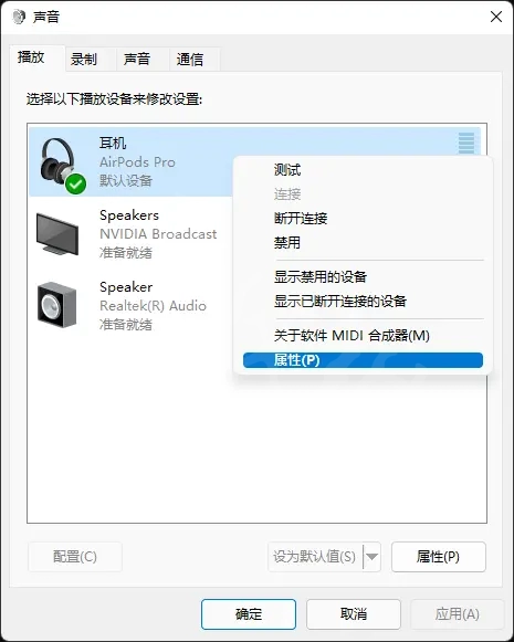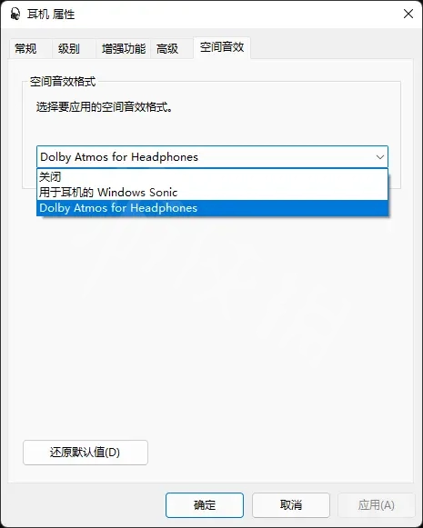 设置完以后打开声音设置-属性-空间音效,然后选择Dolby Atmos for Headphones。