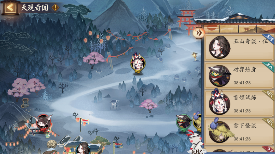 3.组队事件:包括「首领挑战」、「雪下怪谈」,发现怪物并邀请其他阴阳师一起组队挑战,完成后获得「祈梦松」、阴阳寮勋章、金币、随机御魂等奖励;