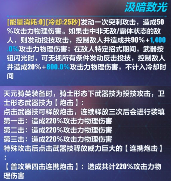 「天元骑英」装备时,骑士形态下武器技能为投技攻击,卫士形态下的武器技能为「炮击」。