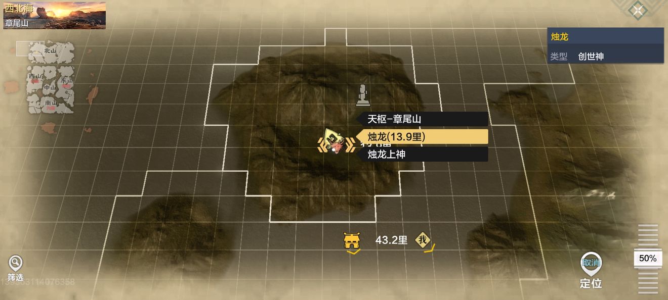 6.前往北山西北方位的章尾山【烛龙】处拜访上神,打开地图可看到任务指引图标【烛龙上神】,选中任务指引图标定位,前往目标位置,即可看到【任务】图标。