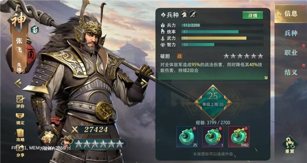 在张飞的三个属性中,他的武力值最为突出,其次是统率。这意味着,张飞比较擅长防御战攻以及物攻类武将,但是极其不擅长防御计策攻击,在面对策攻队时,尽可能调整阵容,换其他策防更强的武将上场。