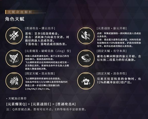 「飞云旗阵」提供的普通攻击伤害提高,当队伍中存在1/2/3/4种元素类型的角色时,数值上进一步追加云堇防御力的2.5%/5%/7.5%/11.5%。