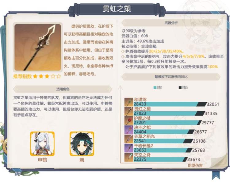 贯虹之槊在盾系武器里其实不算太好,盾系里最好的个人观点是无工之剑,贯虹的话现在很尴尬,没人用,申鹤是后台吃不到盾的buff,胡桃攻击区稀释也比较亏,钟离外观毕业但机制不毕业,魈现在没队友没圣遗物命座有毒很是乏力,出场效果不好。