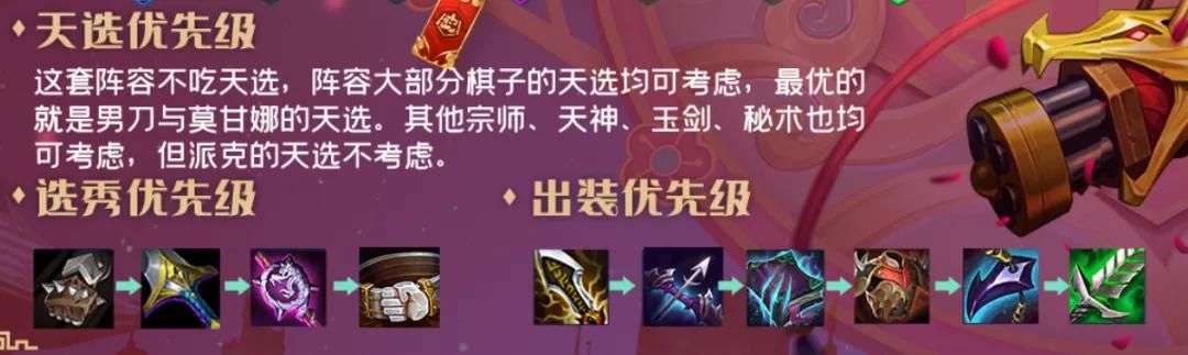 这套阵容不吃天选,阵容大部分棋子的天选均可考虑,最优的就是男刀与莫甘娜的天选。其他宗师、天神、玉剑、秘术也均可考虑,但派克的天选不考虑。