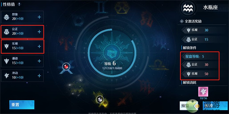 2.如上图所示,我们需要解锁的这个水瓶座,我们可以在红框中看到,我们需要解锁的性格要求是公正30,乐观50,那么就需要在左边的性格值的位置对其进行加点,达到解锁这个星座的性格直。