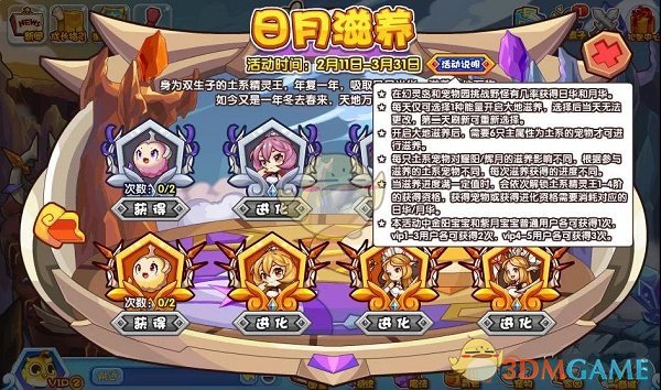7、当滋养进度达到一定数值后即可开启兑换宠物或进化资格啦!兑换的道具可以通过挑战幻灵岛和宠物园的宠物掉落获得。每个宠物/进化资格需要的日华/月华数量不同,一阶的金阳宝宝/紫月宝宝只需要5个日华/月华,后面越高阶段所需数量越多。
