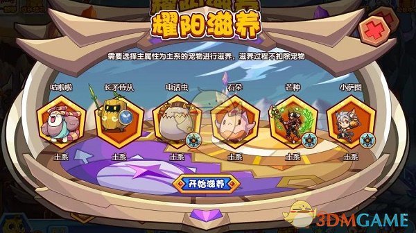 6、滋养需要6只主属性为土系的宠物才可开始滋养,不同的土系宠物会对耀阳滋养或辉月滋养影响不同,比如这里小贝选择的6只宠物中,有3只右下角有耀阳标志,那么就说明本次滋养会有额外进度增加。至于哪些宠物可以增加耀阳滋养进度,哪些宠物可以增加辉月滋养进度,大家也可以一起来找找规律呀!