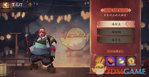 1、赏花灯活动需要玩家对照着剪影的头像猜出式神,然后从三个答案里选择一个,答对即可获得下列奖励。