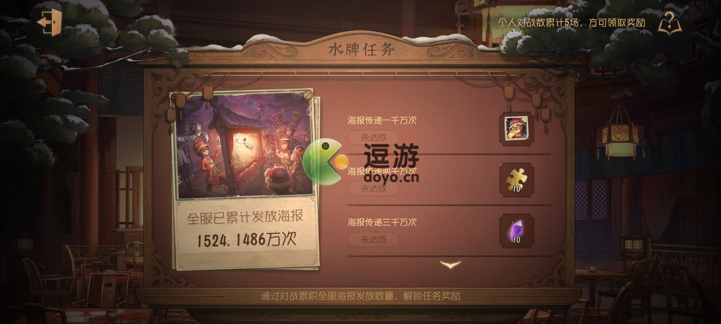 1.简单来说,水牌任务就是个人打满五场匹配,并且达到2000积分以上,然后坐等别人打够后领取全服奖励。